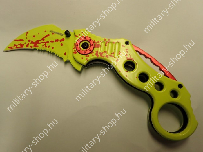 5 1/4" closed. 2 7/8" bright yellow 440 stainless assisted opening partially serrated karambit blade with dual thumb studs, thumb ridge, extended tang and red splatter design. Bright yellow finish aluminum handles with thumb ridge, open design spine, drilled hole and red splatter design. Oversized ring pommel. Black stainless pocket clip.