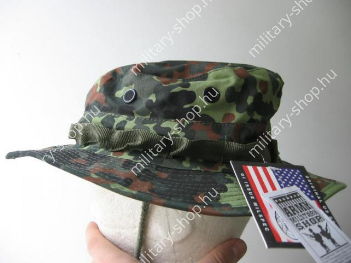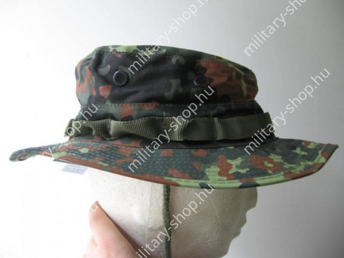 A ,60-as évek közepén tervezték ,e remekbe szabott darabot,és azóta csak a színekben térnek el változatai. A trópusi körülményekre tervezett sapka lényege, a fej védelme, a fákról lehulló különböző élősködők (pl. kulancs) ellen, valamint az ágak ne sértsék fel a fejbőrt, mert az gyorsan elfertőződik a párás környezetben. 4 db sűrű szövésű hálóvat ellátott szellőzőt raktak a sapkára, ezzel egyben megakadályozzak a különféle bogarak bejutását a fejbőrhöz. Alapanyag 100% pamut, rip-stop szövés (szakadásgátlás), mely igen vékony anyag, de nagyon kellemes viselést biztosít a használat folyamán. A sapkát összehajtás után oldalzsebben is tudjuk hordani! Színe:NÉMET LENCSEMINTÁS . Méretei: S=54 ,M=55-56, L=57-58, XL=59-60. Alapanyag német és vélhetőleg Németországban is rakják össze.