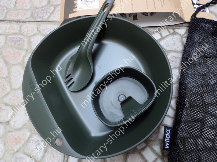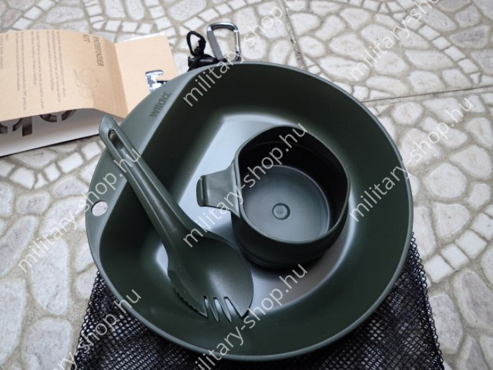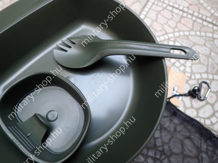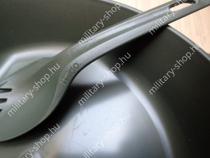 Magas minőségű svéd termék.Katonáknak kifejlesztve . BPA mentes műanyag.Max.: 150 celsius fokig hőálló műanyag evőeszköz 3 funkciós 1-ben. A kanál-kés-villa egy száron van. Kis helyet foglal, könnyű.Az összes funkciója a kanál fejből van kialakítva. Van benne , egy db 250 ml-es összehajtható pohár, és van benne egy tányér is .
