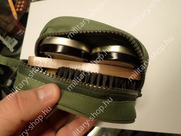 A gyöngyvászon tokban két féle cipőkrémet , ( fekete , színtelen ) és két cipőkefét (bekenő, fényesítő) találunk . A tok színe olívzöld.