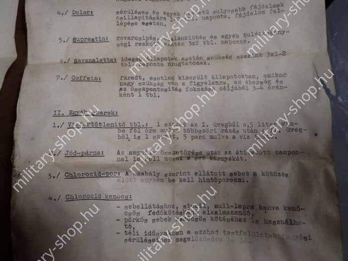 Erre a dologra kicsikét sem mondható , hogy hétköznapi .A Magyar Néphadsereg ejtőernyős alakulatai kapták a készletet.Szerintem az ejtőernyősöknek adott csomagok megfeleltek a kor legkomolyabb követelményeinek is. Érdekessége, hogy a zöld csomagok bontatlanok, sajnos a barna csomagokat tüzetesen átellenőrizve a lista alapján , mindegyikből hiányzik a koffein tabletta.Vélhetően amikor ezeket a készleteket felszámolták, akkor még sorkatonaság volt, a srácok jobb híján bekoffeineztek ! A többi listán szereplő tételek megvannak a csomagokban !