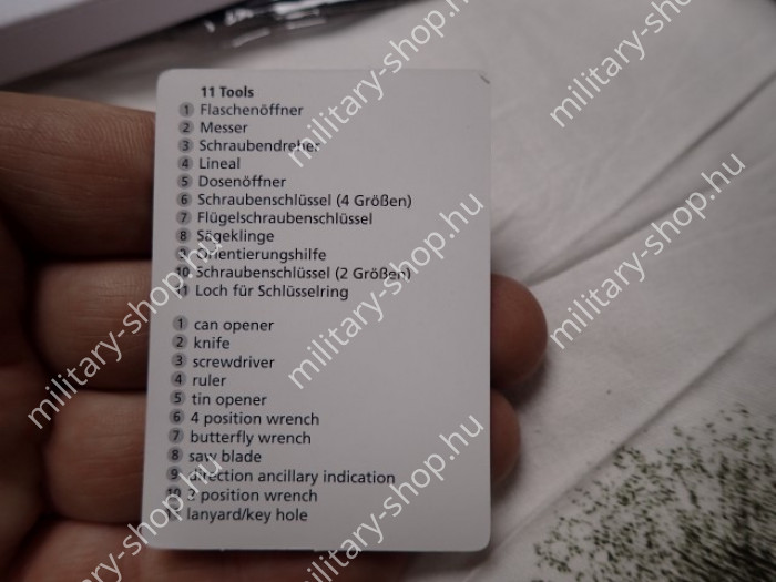 Bankkártya méretű túlélő eszköz. Pénztárcában , vagy a farzsebben is kényelmesen elfér. Van rajta csavarhúzó, konzervnyitó, penge, mérce, fűrész...stb.
